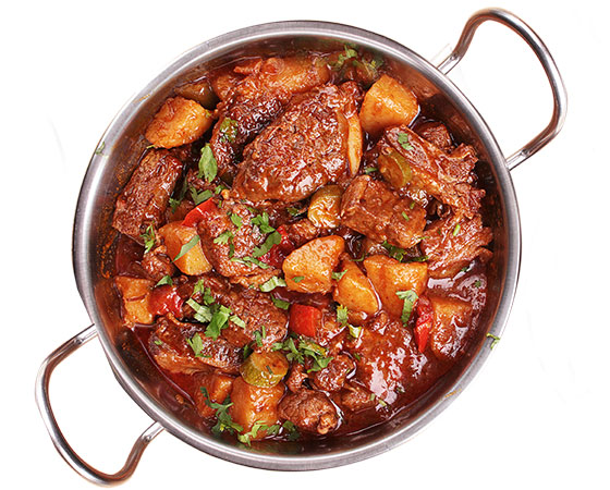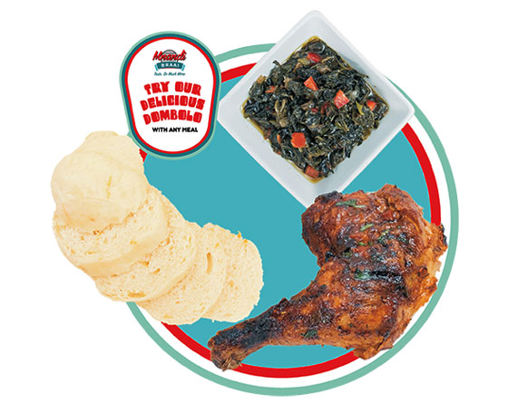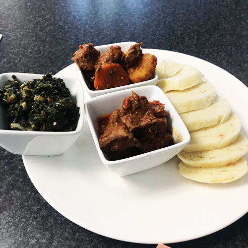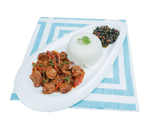 Beef Stew cooked the Mnandi way served with Spinach and your Choice of Pap or Dombolo